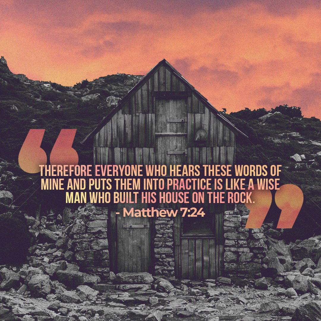 “Therefore everyone who hears these words of mine and puts them into practice is like a wise man who built his house on the rock. The rain came down, the streams rose, and the winds blew and beat against that house; yet it did not fall, because it had its foundation on the rock. But everyone who hears these words of mine and does not put them into practice is like a foolish man who built his house on sand. The rain came down, the streams rose, and the winds blew and beat against that house, and it fell—with a great crash.”